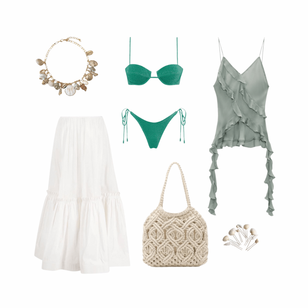 Akin to it’s inspiration, this style is dreamy and mystic. There is no one specific outfit that is the “Mermaid Core It Outfit”, but that leaves lots up for interpretation and personal style. The biggest fashion elements in this trend include maxi skirts, slips, corsets, sheer fabrics, macramé, silk, lace, lettuce hems, and sequins.